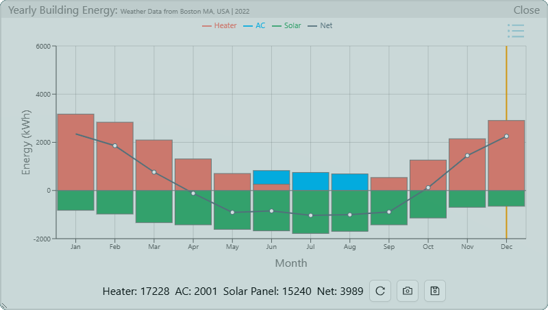 In achieving the goal, we have used triple-pane windows, which typically have a U-value of about 0.25 (U.S. unit). The R-value for the walls and roof are set to be 20 (U.S. unit). These chosen values may be on the higher end of insulation. More options are recommended by the International Energy Conservation Code for different climate zones (Massachusetts is in zone 5A).