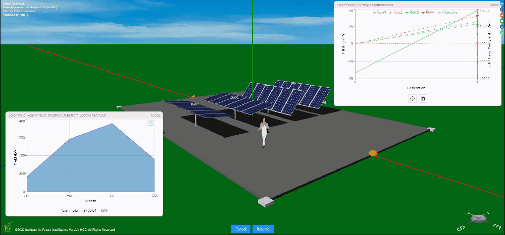 Aladdin aims to integrate AI deeply into CAD software to explore this new human-technology frontier. This article introduces the concept of visual evolutionary computation implemented in Aladdin based on genetic algorithms (GA), which is one of the most widely-used techniques in AI because of its simplicity (although Aladdin also provides another option for implementing bio-inspired evolutionary computation, namely the particle swarm optimization method, this article focuses mainly on GA for conceptual clarity). The embedded window below provides a simple example about finding the optimal tilt angle for a single row of solar panels aligned in the east-west axis, which may give you some basic ideas about this concept through observing its actions. To start, click the gray foundation under the solar panels first and then click the Run button that will then appear at the bottom of the graph window. After that, Aladdin will show you step by step how it arrives at the optimal solution through a sequence of structure generation and function evaluation procedures driven by evolutionary principles (e.g., genetic selection, crossover, and mutation). The graph will provide a visual representation of the entire process on the fly.