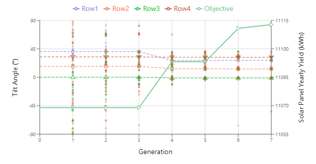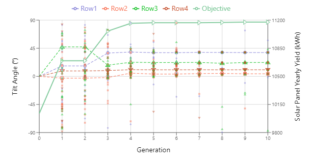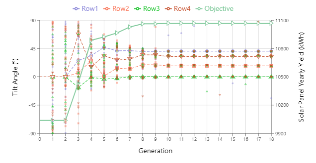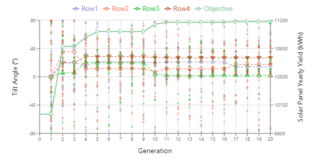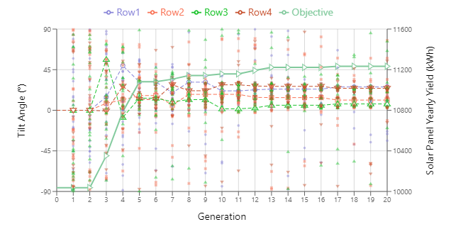 Let's consider a design problem comprising four rows of solar panels that have all but their tilt angles determined. The four tilt angles form a design space with four independent dimensions. Each tilt angle is represented in GA as a "gene," with its value being a continuous number ranging from -90° (north-facing) to 90° (south-facing). A sequence that combines all the genes is referred to as a "chromosome." Each chromosome can be translated into an individual solution called a "phenotype," which represents an observable physical conformation of the four rows of solar panels. The following animation shows the evolution of design solutions driven by GA. The graph on the right also shows how GA explores the design space and converges to the final solution at the end of a run. The left axis of this biaxial graph represents the four tilt angles and the right axis the energy output of the best among all the solutions selected at each step of evolution, which is known as a generation in GA.