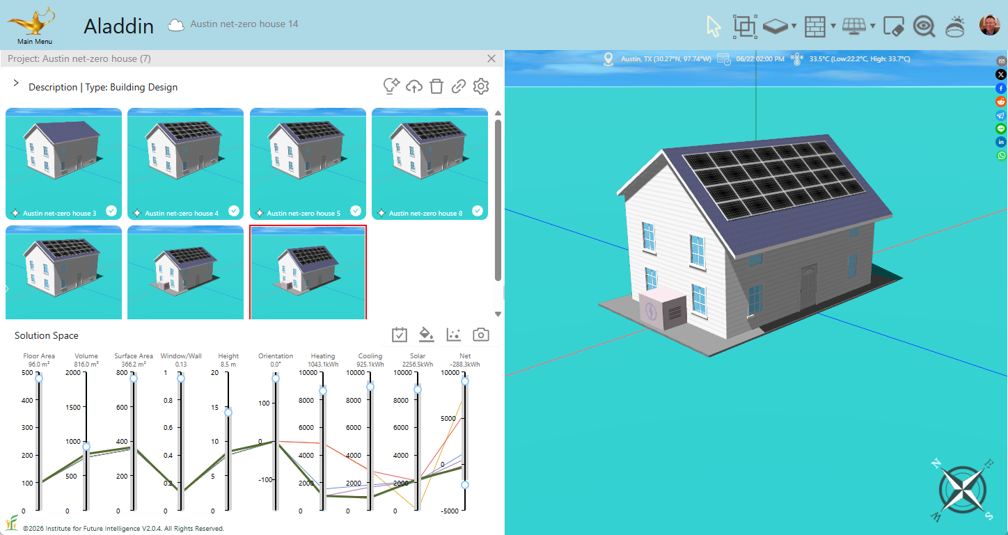 Added battery storage for energy storage and increased south overhang for solar shading. Reduced SHGC (increased opacity) on west-facing windows.