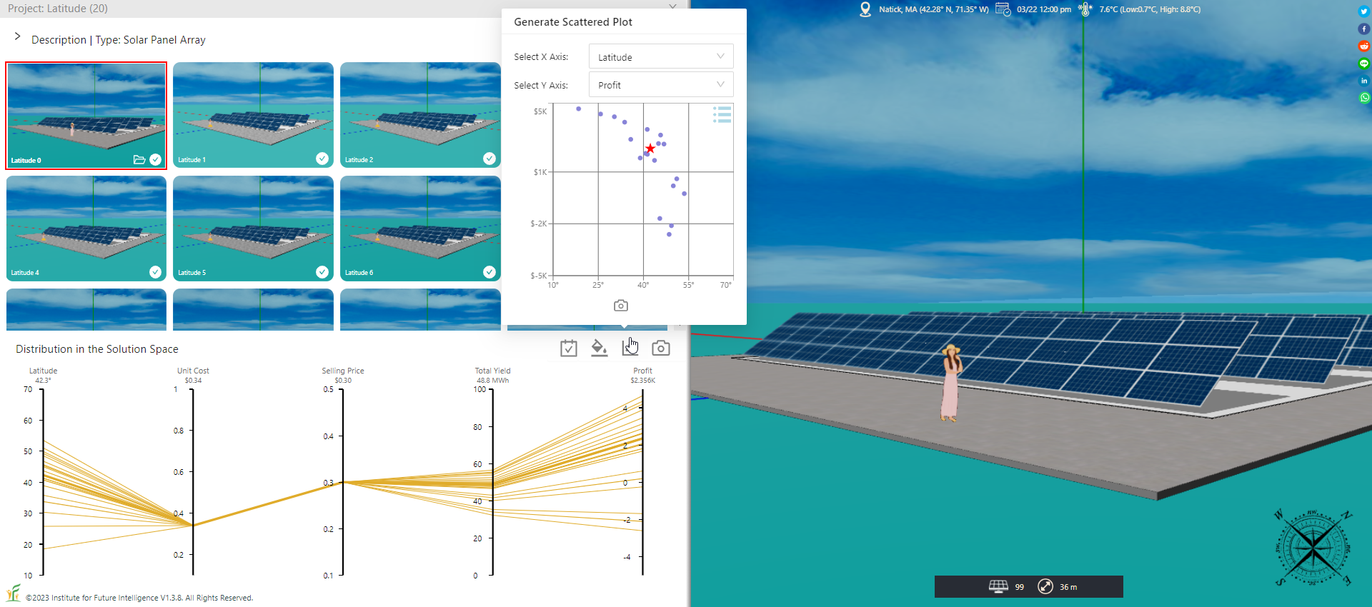 Using the same method, you can also invesigate the relationship between the output and the latitude. As you can see from the following image, the same design of a solar panel array can have very different profitabilities in different locations.