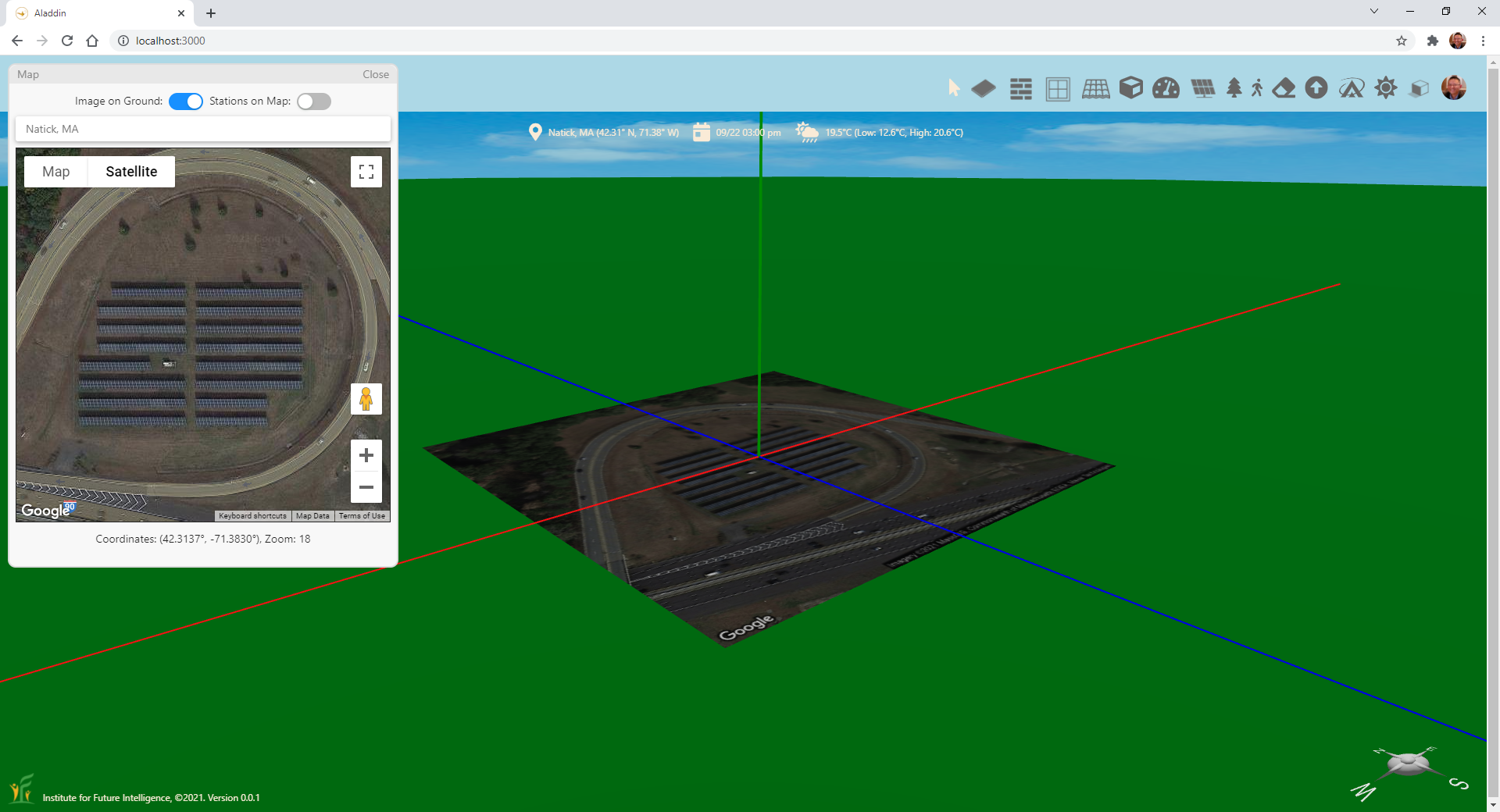 If you do not already have a solar farm to model in mind, you can browse your area in Google Maps to find a solar farm that interests you. Once you find one, you can copy and paste its latitude and longtitude to the Address Field above the map image in the Map Window of Aladdin and press Enter to load the respective map. Make sure that you select the Satellite view so that we can see the image of the existing solar panels. Zoom in the satellite image so that the solar farm looks as large as possible but is still fully shown in the image. Then select "Image on Ground." You should see that the satellite image is imported into the 3D scene to cover a portion of the ground. The image centers at the origin of the coordinate system.
