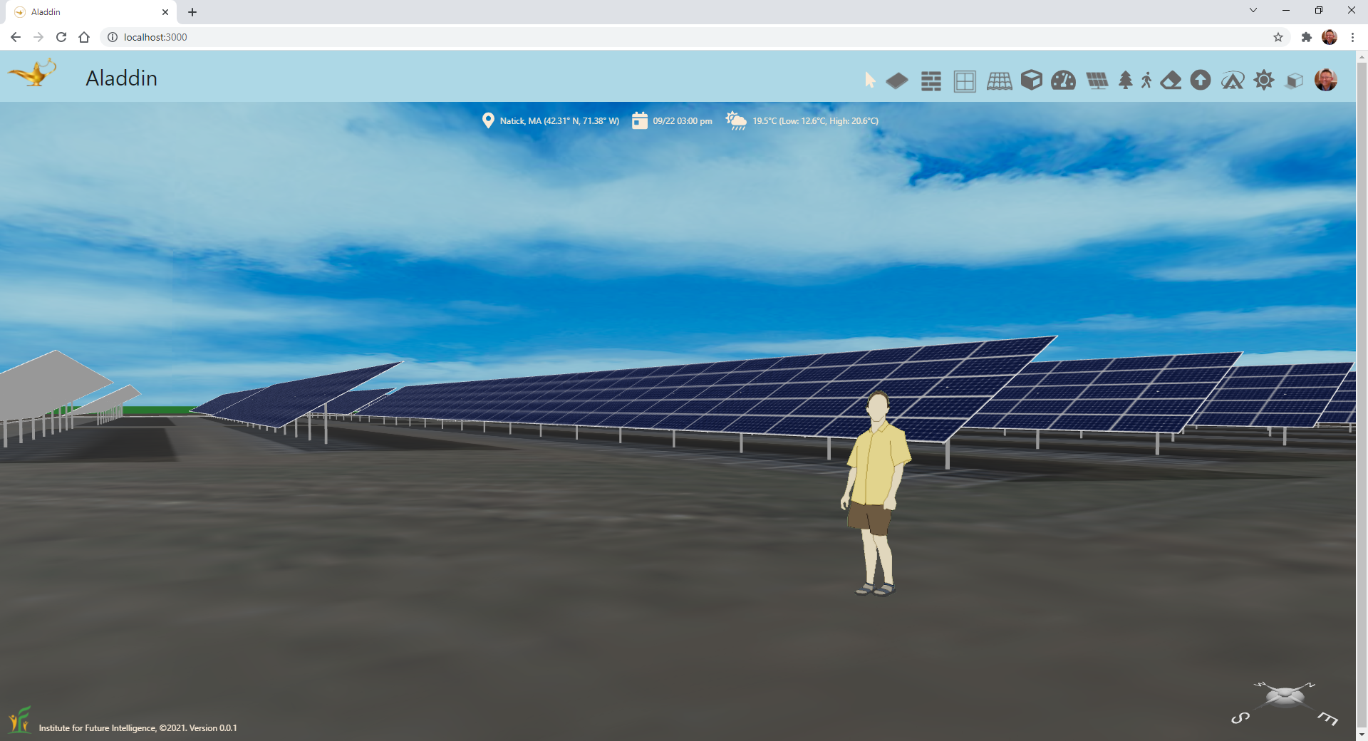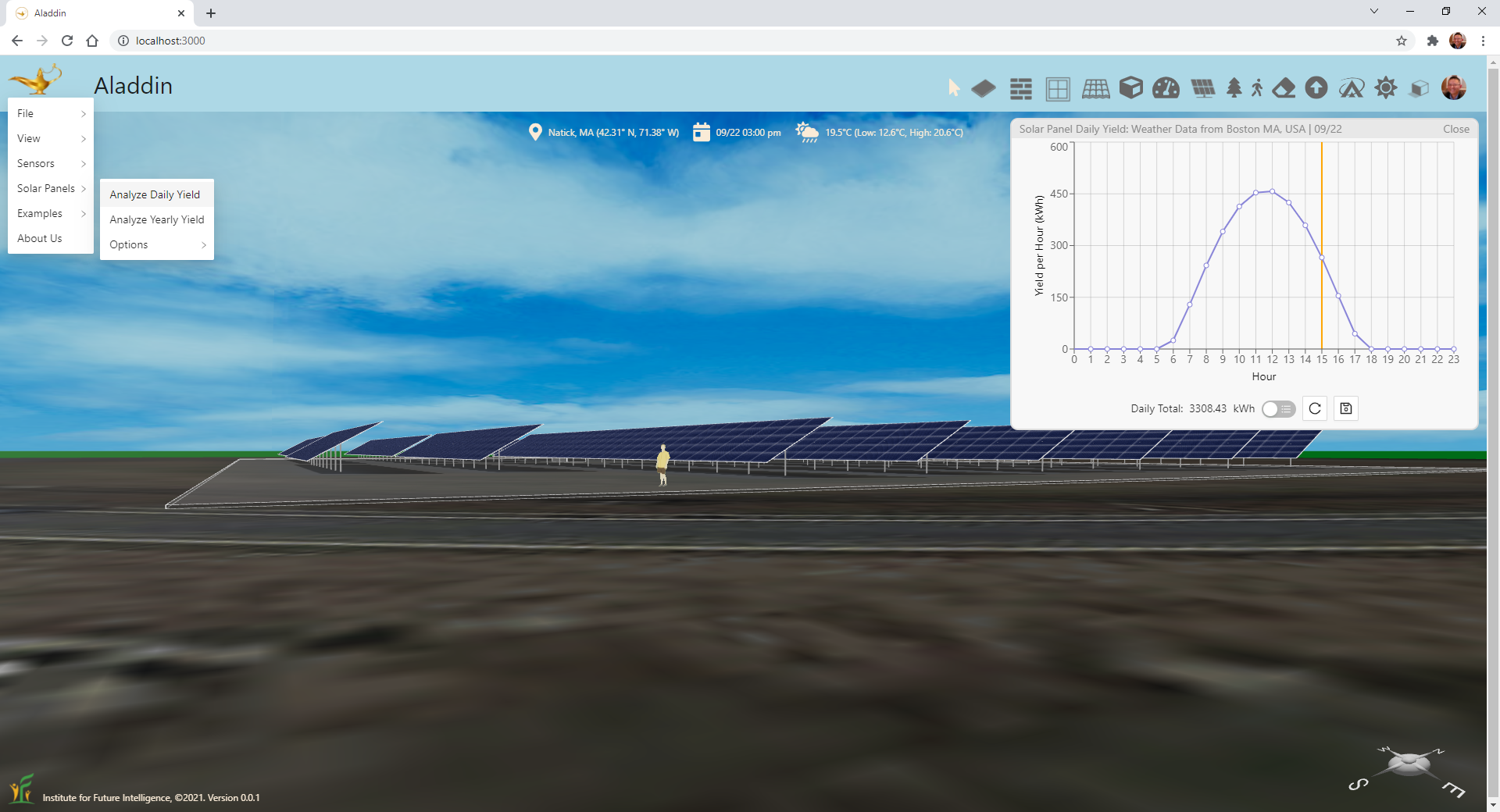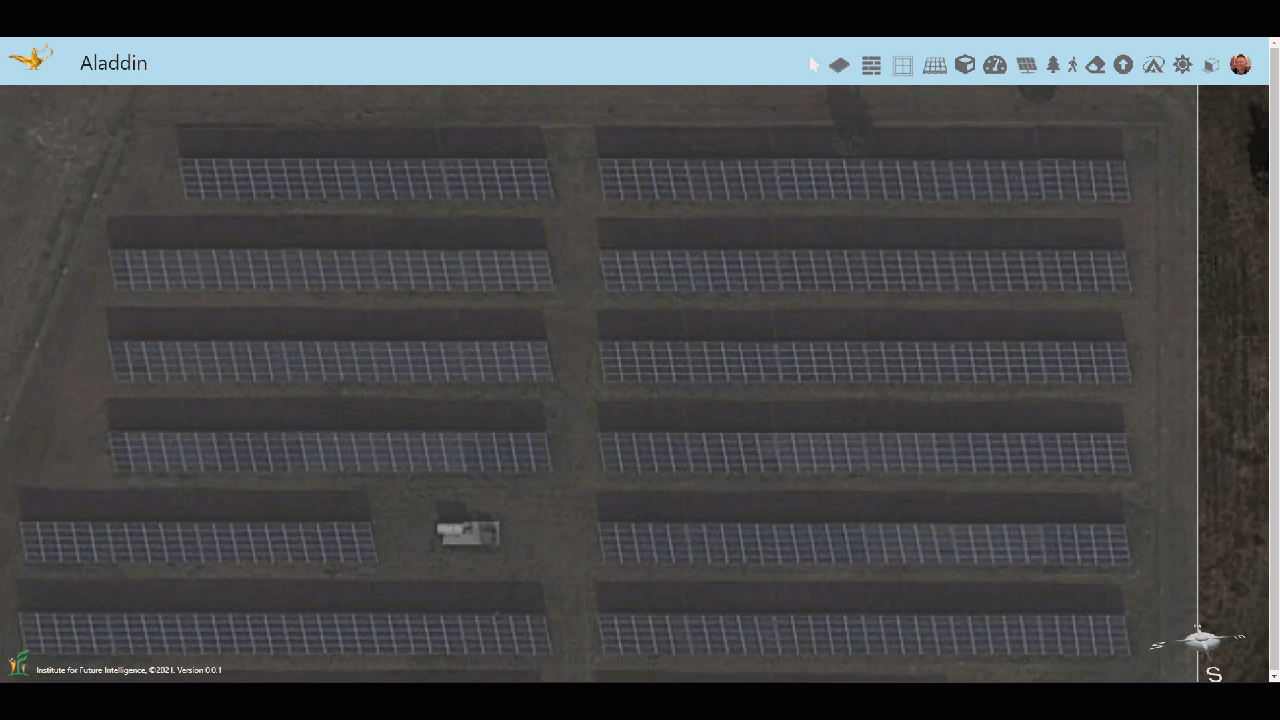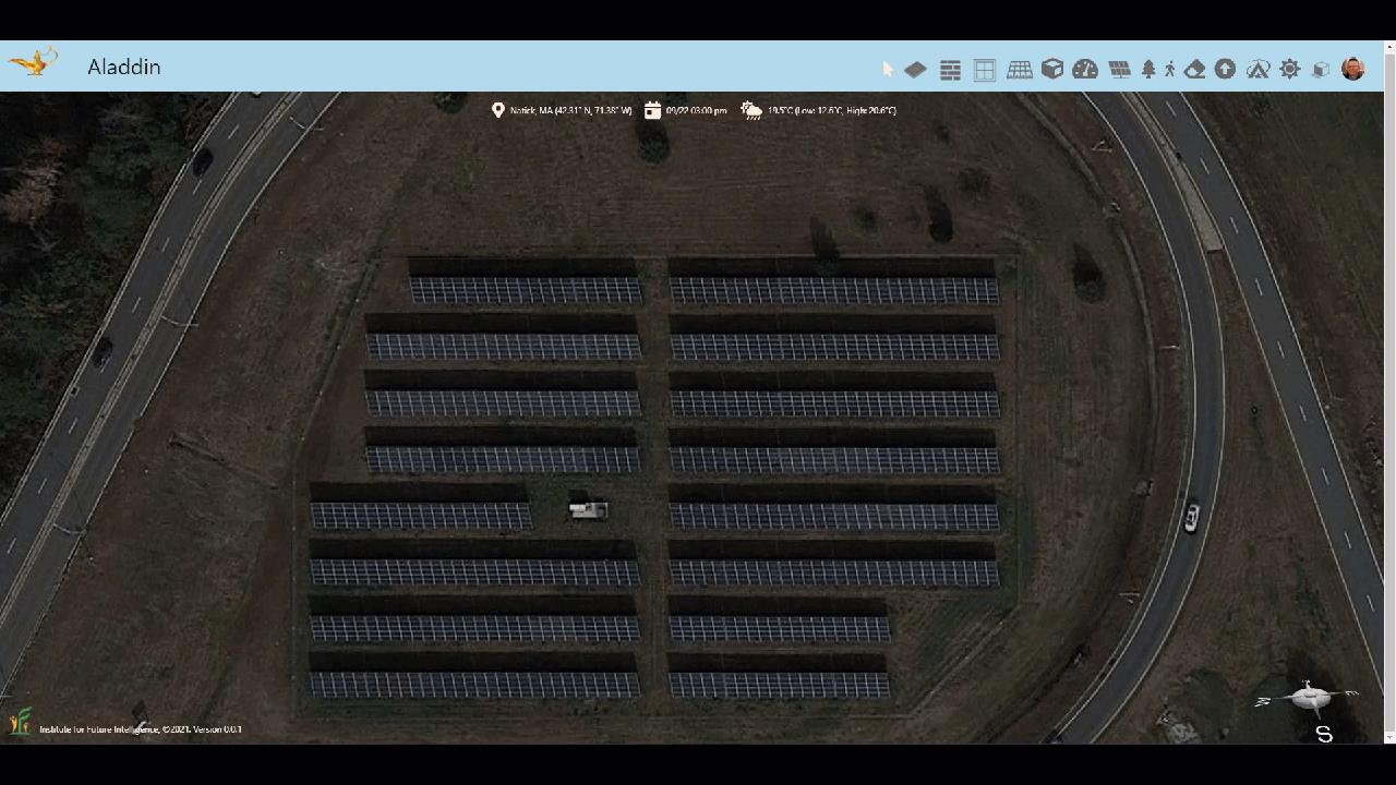 We have shown you how to create a realistic 3D model of a solar farm and simulate its electricity generation within your browser. Note that, with Aladdin, you can experiment with many more design parameters and options. For example, without changing the layout of the solar farm, you can change the tilt angle to find out the value that may result in the hightest annual output. The integration with Google Maps also allows you to model any existing solar farm anywhere. These modeling and design capabilities make Aladdin an ideal platform for teaching and learning engineering design in the context of renewable energy.