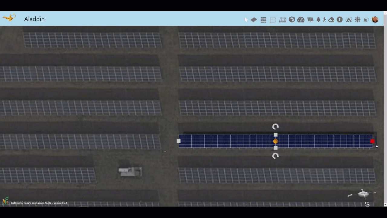 In Aladdin, you cannot add a solar panel directly to the ground. You will need to add a foundation first. Click the Foundation button on the toolbar. Then click on the ground to drop a foundation. You can drag the handlers to resize it. The following animation shows how to create a foundation that covers the whole solar farm shown in the satellite image. Note that when an image is shown on the ground, the foundation becomes translucent so that you can still see what is beneath it. This is important as we need to see through the foundation so that we can draw solar panels on top of it to match the dimension and orientation of the existing arrays.