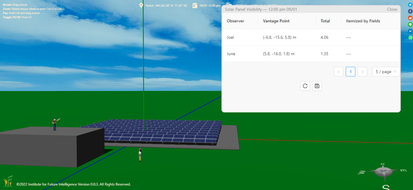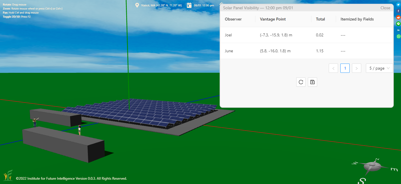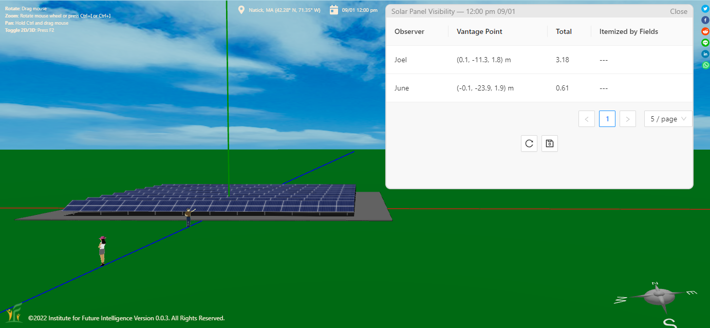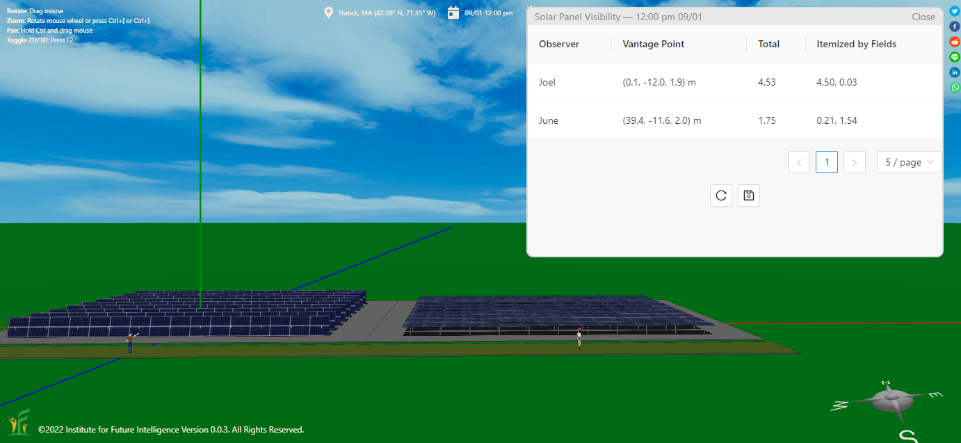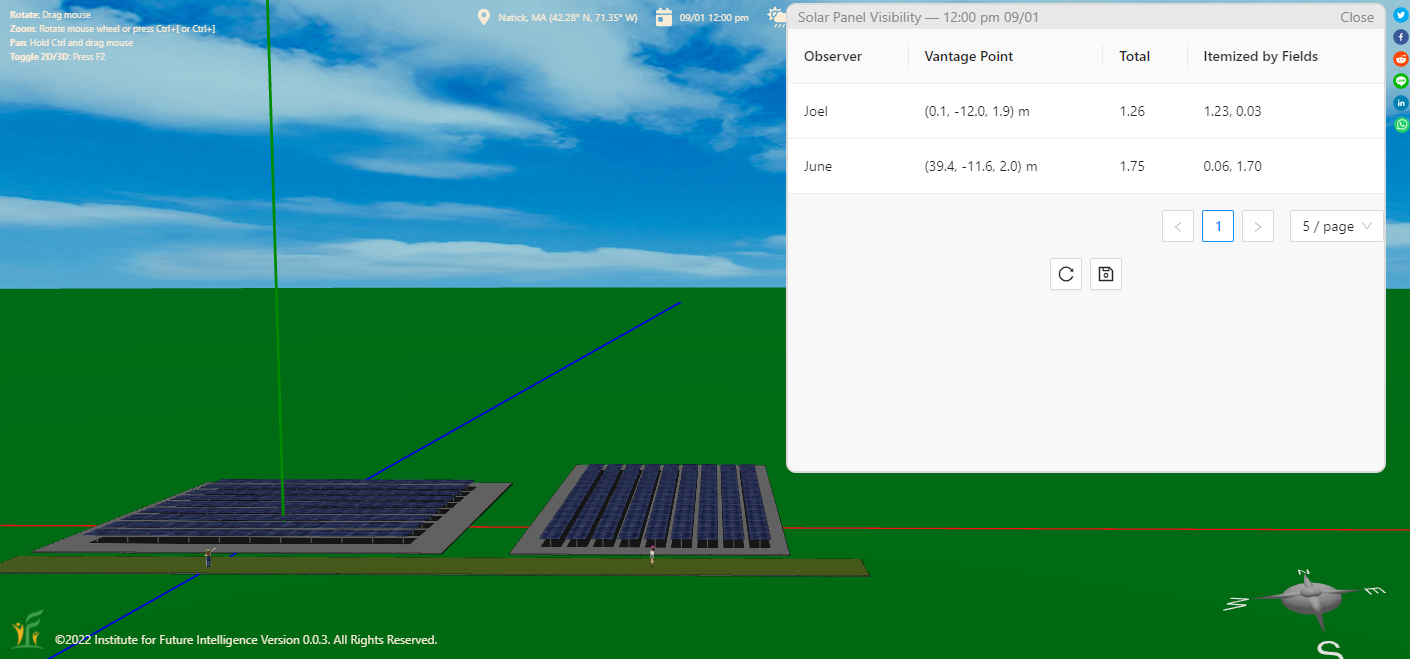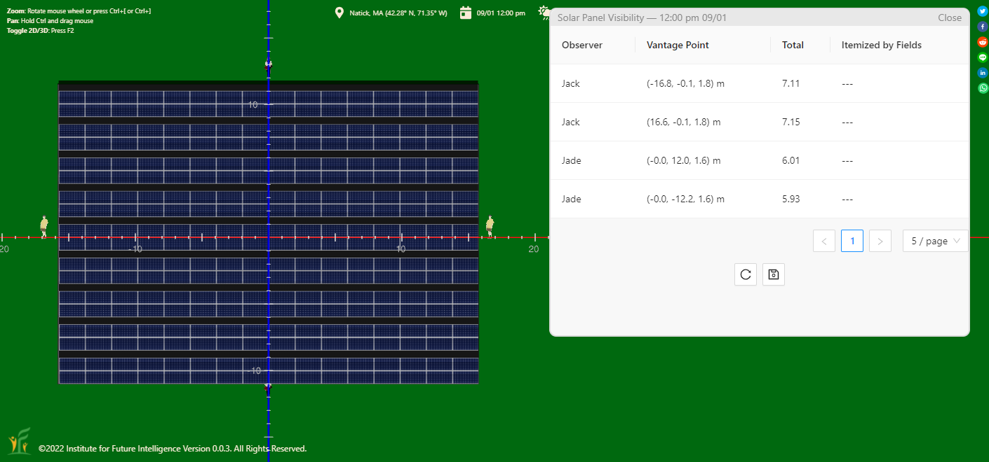 Solar panels that face the observer more directly are more visible. The following screenshot shows that the result passes this test. This also shows itemized results for each solar fields, in addition to the total scores.