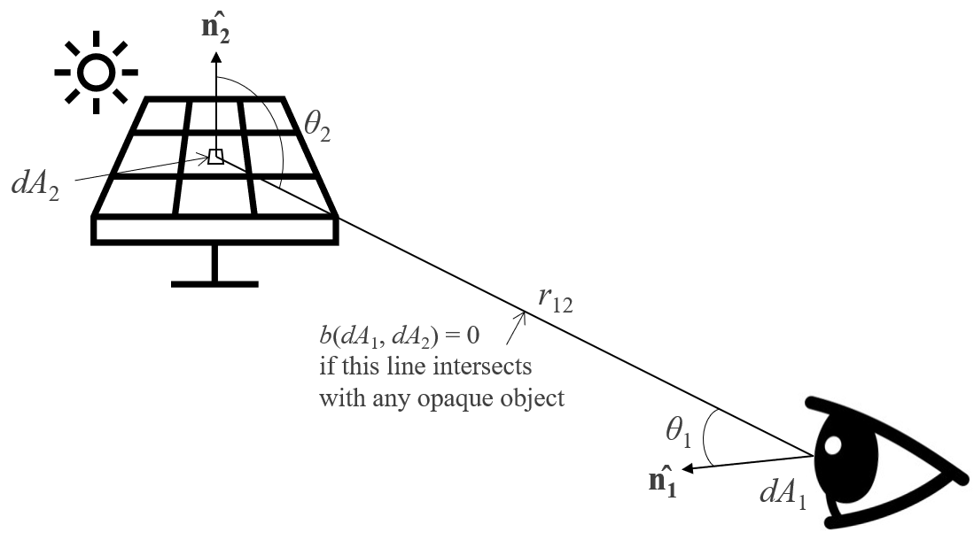 The view factor from a surface A1 (e.g., eyeball) to another surface A2 (e.g., solar panel)