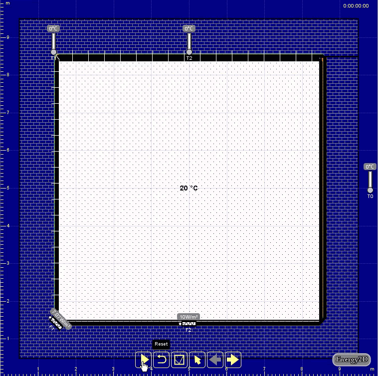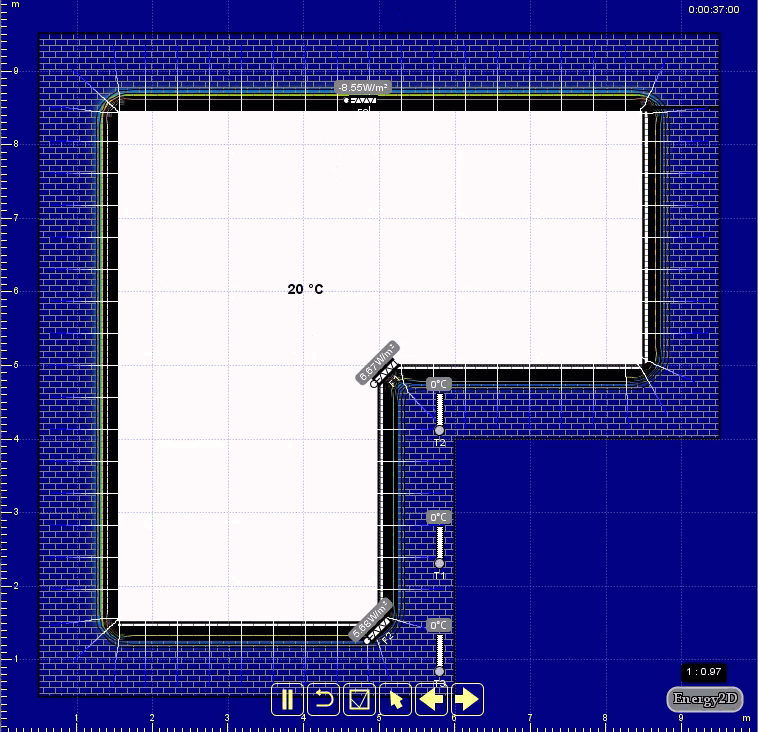 Unsure about the net outcome of these competing factors, I made some Energy2D simulations to see if they can enlighten me. Figure 4 shows the first one that uses a block of object remaining at 20°C to mimic a warm room with four walls and the surrounding environment at 0°C. Temperature and heat flux sensors are placed at a corner, as well as the middle point of a wall. The results show that the corner is indeed colder than the middle part of a wall. Heat flux results suggest that the corner loses heat faster than the middle part in the stable state.
