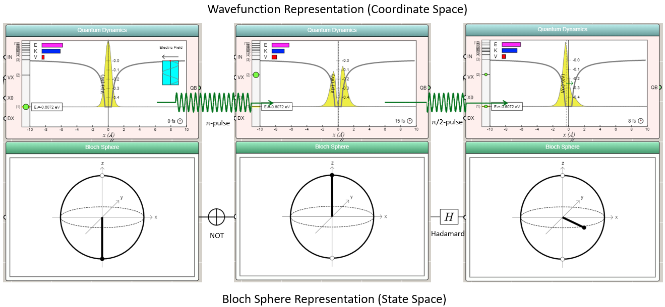As the result of the quantum dynamics is animated instantaneously, students can observe the time evolution of the wavefunction or probability distribution as well as the rotation of the state vector on the Bloch sphere. The two representations of the quantum phenomenon, typically introduced to students separately (the wavefunction one more commonly in physics whereas the Bloch sphere one more commonly in computer science), are now unified in a single simulation a click away in a Web browser.